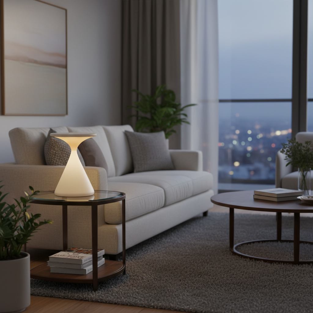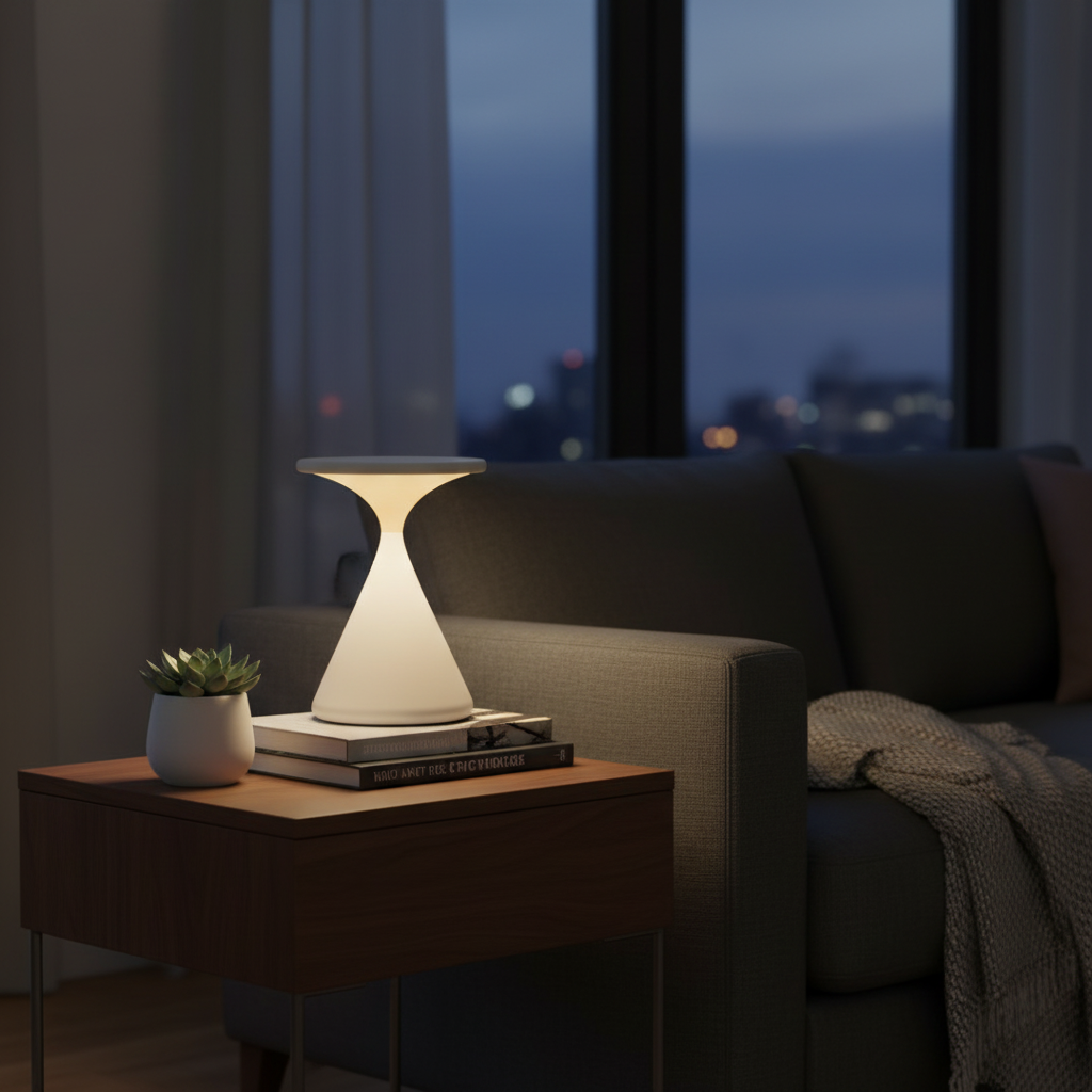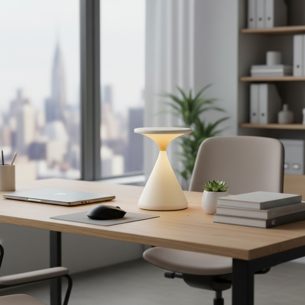 The Aeron Hourglass table lamp features a sleek and modern design, making it a perfect addition to any living space or office. Its wireless functionality allows for versatile placement without the hassle of cords, providing a stylish and practical lighting solution.